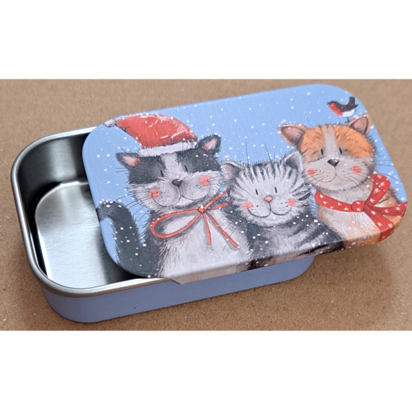 Plechová dózička s posuvným víkem, uvnitř nedělená. Vhodná na léky nebo malé bonbonky, vánoční motiv: kočka; autorkou je anglická malířka Alex lark, zn. ALex Clark Art