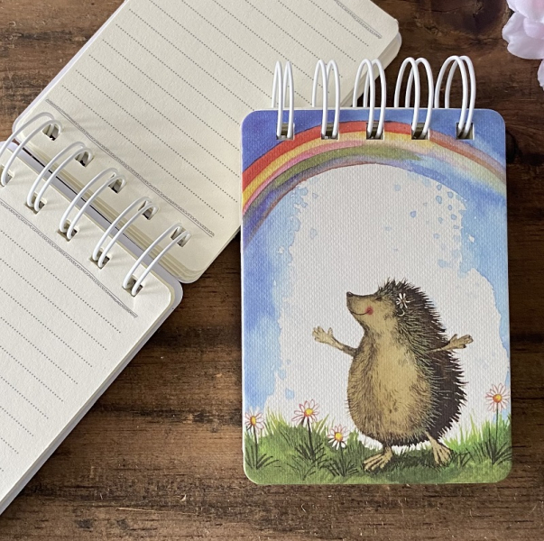 Malý spirálový linkovaný bloček s tvrdými deskami a plastovou kapsičkou uvnitř. S motivem: ježek, duha; autorkou je anglická malířka Alex Clark. Rozměr 10,5*7,5*1,5 cm (se spirálou 11,5 cm), značka Alex Clark Art.