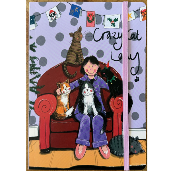 Velký tlustý linkovaný zápisník s měkkými deskami a gumičkou, která brání otevření zápisníku. Na přední desce uvnitř je text "This book belongs to ...". Vánoční motiv: kočka, dívka; autorkou je anglická malířka Alex Clark. Rozměr 21*15*1 cm, značka Alex Clark Art.