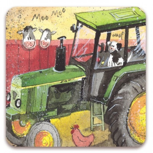 Korková podložka pod skleničku, motiv: traktor, dvorek a zvířátka, autorkou je anglická malířka Alex Clark. Velikost 10*10 cm, značka Alex Clark Art.