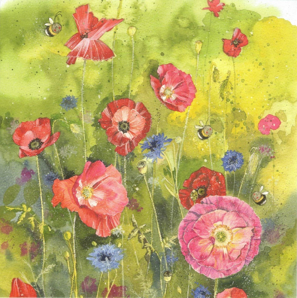 Přání do obálky, motiv: vlčí mák, chrpa, včelka; autorkou je anglická malířka Alex Clark. Rozměr 14*14 cm, značka Alex Clark Art.