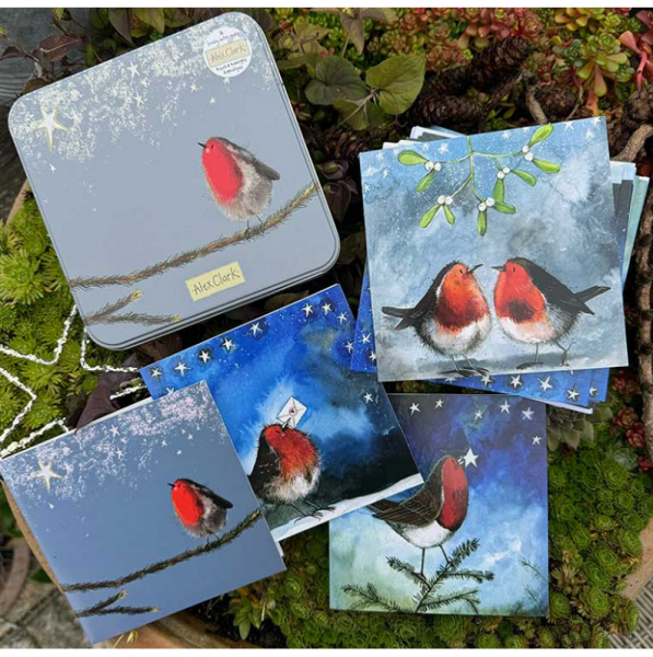 • Přání do obálky v plechové dóze, bez textu uvnitř, 16 kusů, motiv: ptáček červenka, jmelí; značka Alex Clark Art.
