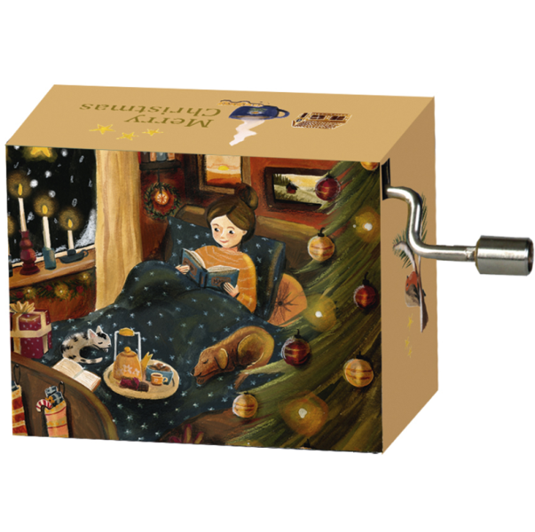 Kovový hrací strojek s kličkou, v papírové krabičce s vánočním obrázkem. Hraje část vánoční písně Wish you a Merry Christmas.