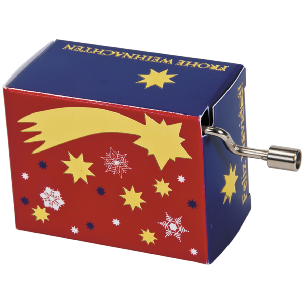 Kovový hrací strojek s kličkou, v papírové krabičce s vánočním obrázkem komety. Hraje část vánoční písně Rolničky, rolničky.