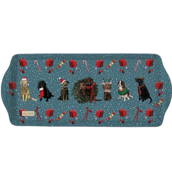 Melaminový tácek s motivem: pes; autorkou je anglická malířka Alex Clark. Není určen pro přímý styk s potravinami. Značka Alex Clark Art.
