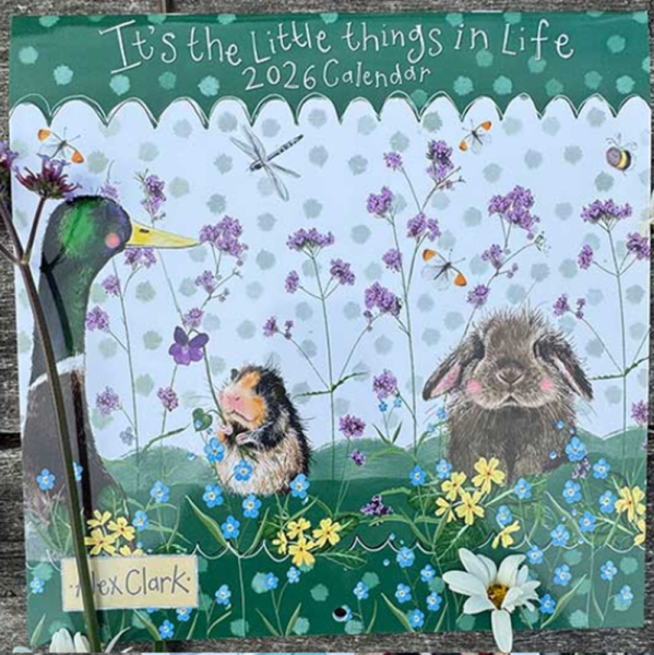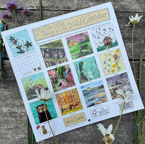 měsíční kalendář na rok 2026, na pověšení, na horní části obrázky malých zvířátek, na spodní části měsíční kalendář na poznámky, autorkou je anglická malířka Alex Clark, značka Alex Clark