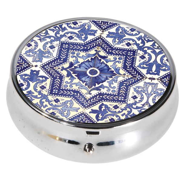 Kovová dózička na léky s pantem. Uvnitř se zrcátkem a dělenou plastovou vložkou. Povrch obrázku je ze syntetické pryskyřice. S motivem klasických dlaždic z portugalského Lisabonu.