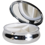Kovová dózička na léky s pantem. Uvnitř se zrcátkem a dělenou plastovou vložkou. Povrch obrázku je ze syntetické pryskyřice.