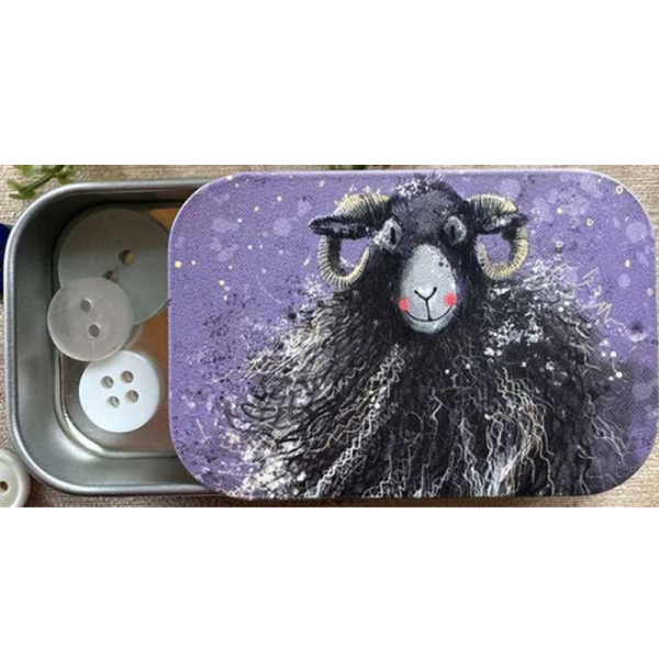 Plechová dózička s posuvným víkem, uvnitř nedělená. Vhodná na léky nebo malé bonbonky, motiv: beran; autorkou je anglická malířka Alex Clark, zn. ALex Clark Art