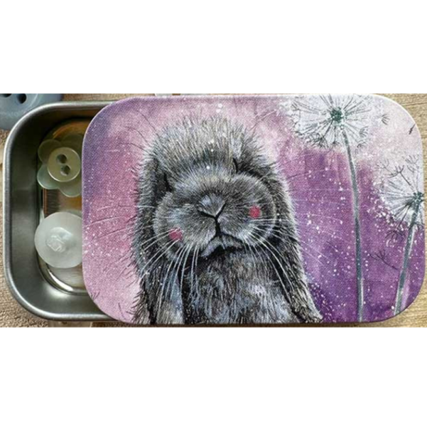 Plechová dózička s posuvným víkem, uvnitř nedělená. Vhodná na léky nebo malé bonbonky, motiv: králík; autorkou je anglická malířka Alex Clark, zn. ALex Clark Art