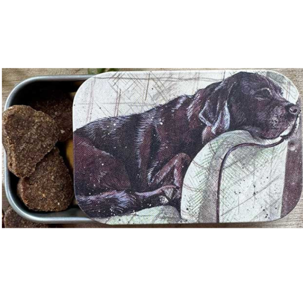 Plechová dózička s posuvným víkem, uvnitř nedělená. Vhodná na léky nebo malé bonbonky, motiv: pes; autorkou je anglická malířka Alex Clark, zn. ALex Clark Art