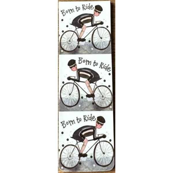 Magnetická záložka do knihy, motiv: cyklista, kolo; autorkou je anglická malířka Alex Clark. Rozložená má rozměr 2,5*16 cm, složená 2,5*8 cm, značka Alex Clark Art.