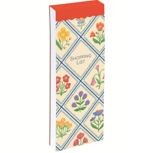 Trhací poznámkový bloček s barevnou podložkou, listy mají okraj ve stejném motivu, jaký je na obalu; motiv: květiny. Značka Gifted Stationery Company