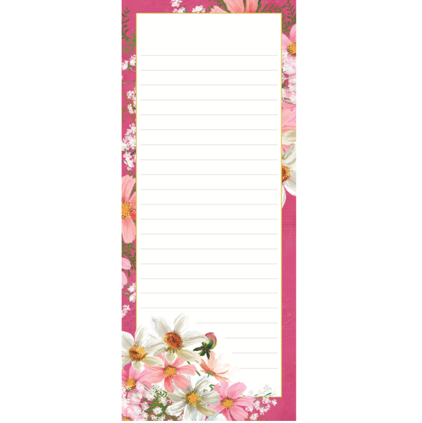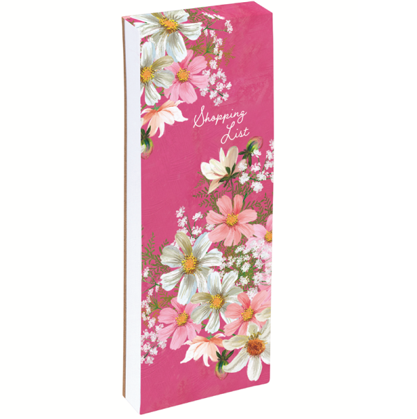 Trhací poznámkový bloček s barevnou podložkou, listy mají okraj ve stejném motivu, jaký je na obalu; květinový motiv. Značka Gifted Stationery Company