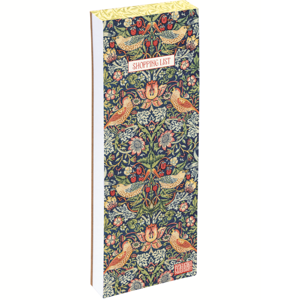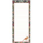 Trhací poznámkový bloček s barevnou podložkou, listy mají okraj ve stejném motivu, jaký je na obalu; květinový motiv Strawberry Theif od anglického výtvarníka Williama Morrise. Značka Gifted Stationery Company