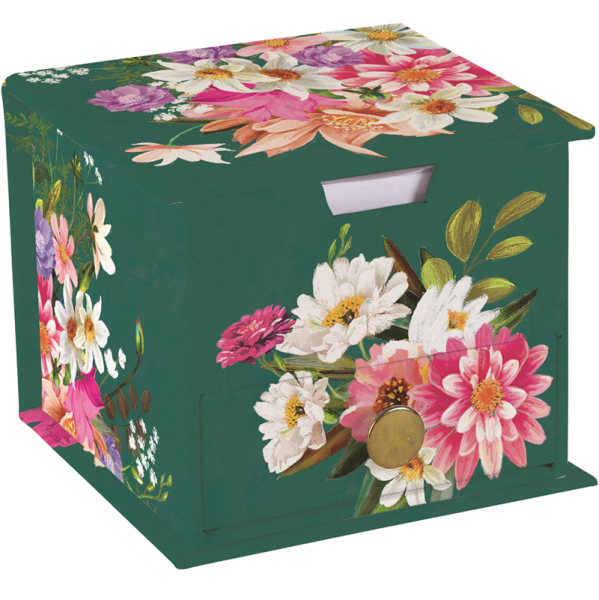 Zásobník obsahuje 400 papírků 10*10 cm a malou zásuvku, která je ideální pro uložení drobností; motiv: květiny. Krabička má rozměr 12*11*10 cm. Značka Gifted Stationery Company