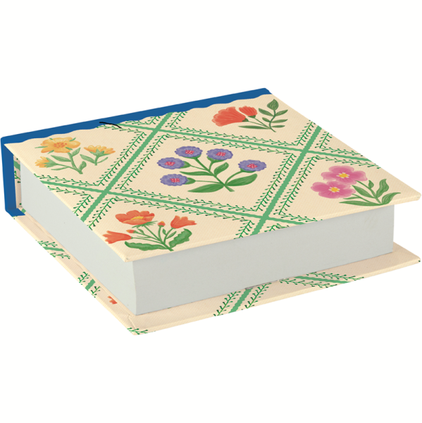 Bloček s trhacími papírky ve tvrdých deskách, papírky mají 5 mm okraj ve stejném motivu, jaký je na deskách; květinový motiv. Desky mají rozměr 14*13,5*3,5 cm. Značka Gifted Stationery Company