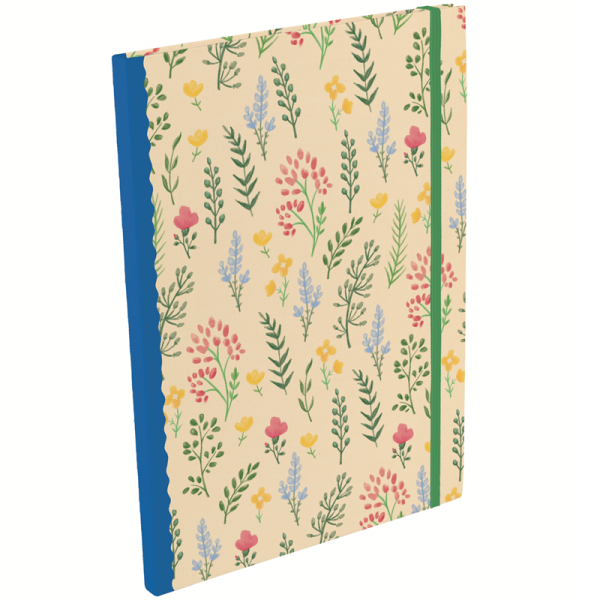 Zápisník s pružnou šitou vazbou má 176 listů bílého linkovaného papíru, gumička brání otevření zápisníku. Motiv: květiny. Značka Gifted Stationery Company
