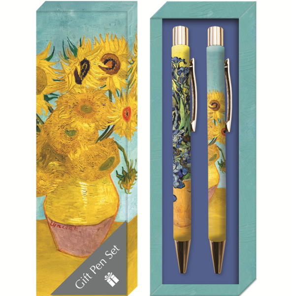 Sada dvou kovových propisek v dárkové krabičce s velkoobsahovou černou náplní, motivy obrazů od Vincenta van Gogha: Slunečnice a Kosatce. Krabička 17,5*6*2,6 cm, značka Gifted Stationery Company