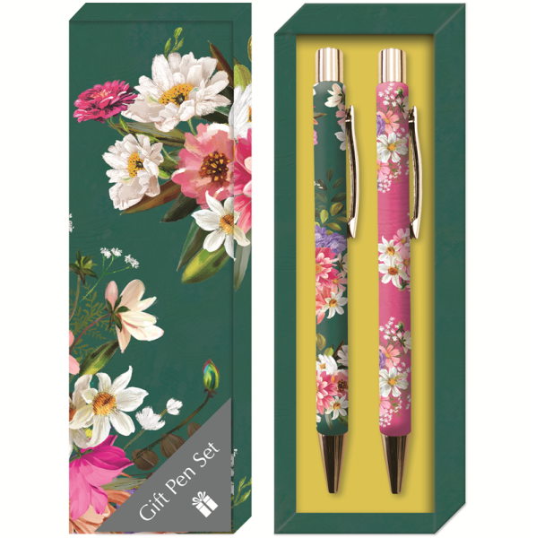 Sada dvou kovových propisek v dárkové krabičce s velkoobsahovou černou náplní, motiv: květiny. Krabička 17,5*6*2,6 cm, značka Gifted Stationery Company