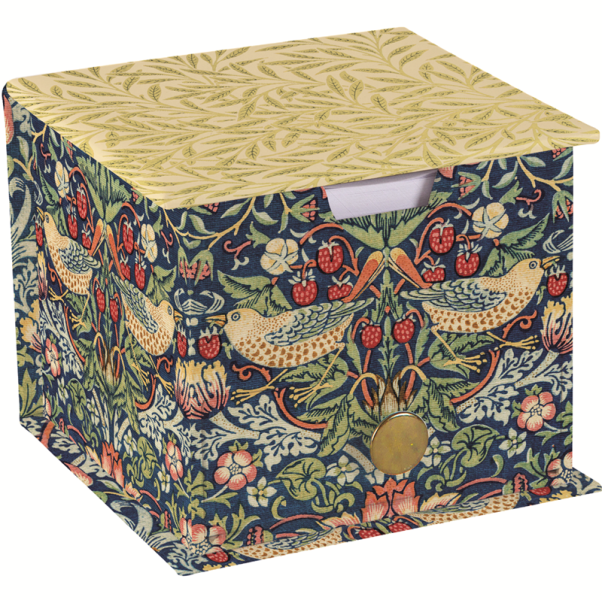 Zásobník obsahuje 400 papírků 10*10 cm a malou zásuvku, která je ideální pro uložení drobností; motiv: Strawberry Theif, autor: William Morris. Krabička má rozměr 12*11*10 cm. Značka Gifted Stationery Company