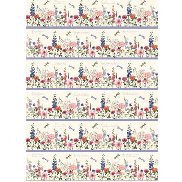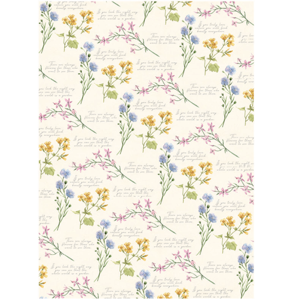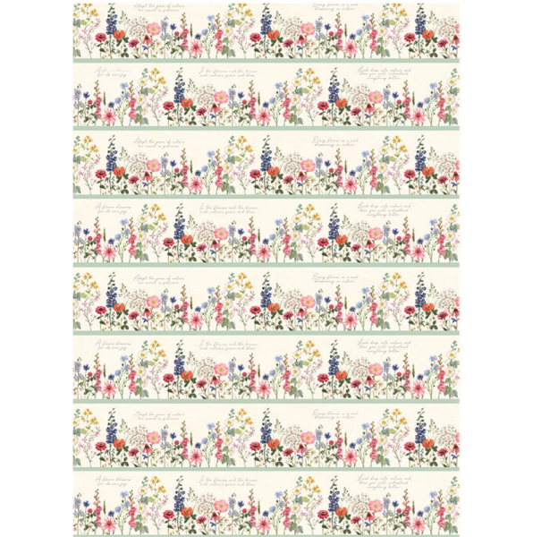 Balící papíry ve formě knihy s měkkými deskami. Složené papíry jsou u hřbetu perforované, lehce se oddělí. Součástí balení je i 22 odpovídajících dárkových visaček; motiv: květiny. Značka Gifted Stationery Company