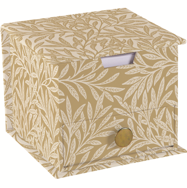 Zásobník obsahuje 400 papírků 10*10 cm a malou zásuvku, která je ideální pro uložení drobností; motiv: Willow, autor: William Morris. Krabička má rozměr 12*11*10 cm. Značka Gifted Stationery Company