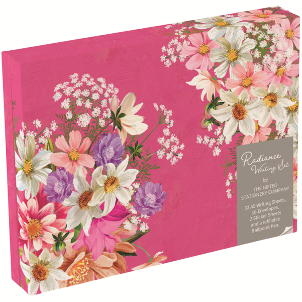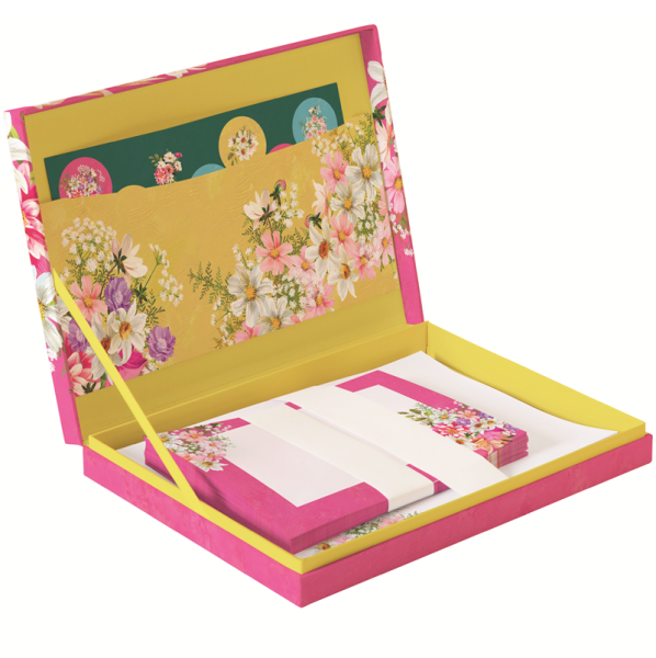 Dopisní papíry, obálky, kuličkové pero a samolepky v krabičce - vše v jednotném motivu: květiny. Značka Gifted Stationery Company