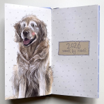 Kapesní diář na rok 2026 obsahuje záložku z modré stužky, diář obsahuje spoustu ilustrací, motiv: pes; autorkou je anglická malířka Alex Clark, značka Alex Clark Art.
