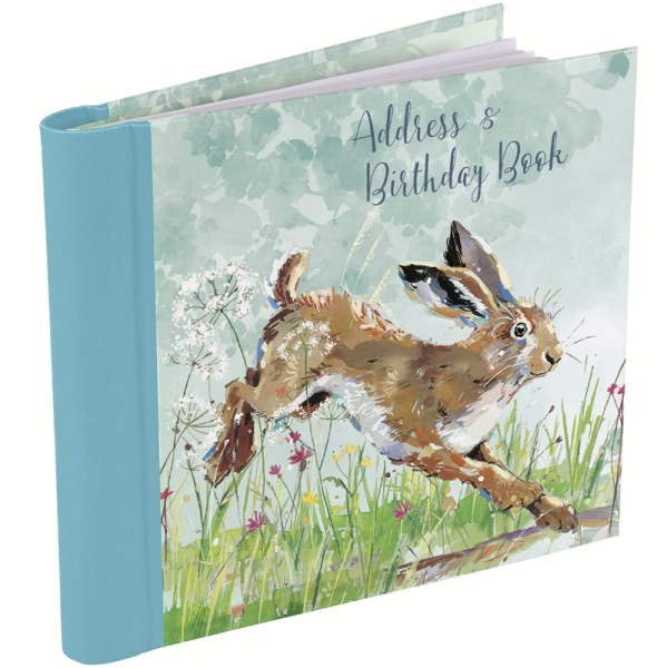 Adresář má spirálovou vazbu potaženou látkou, obsahuje 100 listů na adresy s tříděním podle abecedy a 100 listů tříděných podle měsíců k zaznamenávání narozenin. Motiv: zajíc; značka Gifted Stationery Company