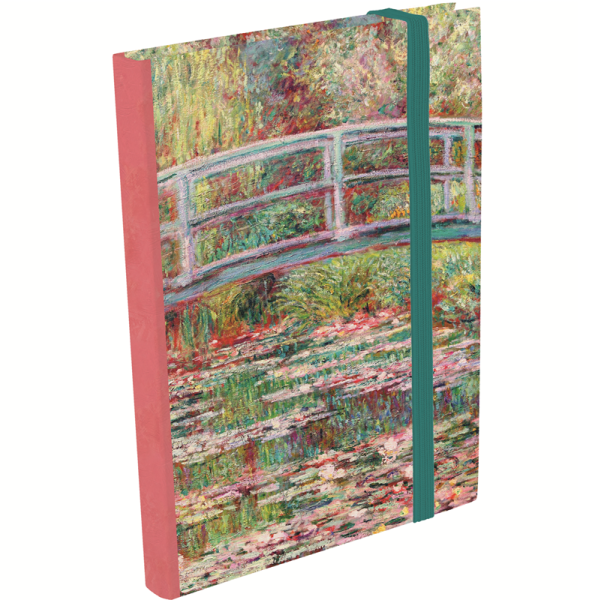 Zápisník s pružnou šitou vazbou má 176 listů bílého linkovaného papíru, gumička brání otevření zápisníku. Motiv obrazu Japonský most, autor Claude Monet. Značka Gifted Stationery Company