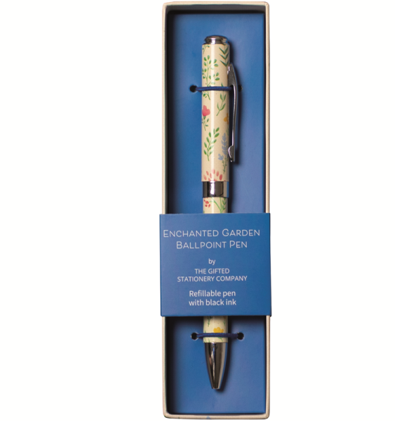 Kovová propiska v dárkové krabičce s černou náplní, otočné zavírání, motiv: květiny; krabička 16*6*2,6 cm, značka Gifted Stationery Company