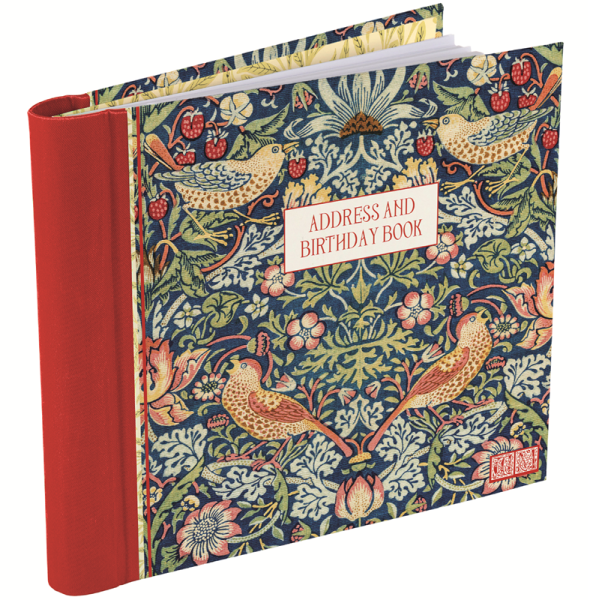 Adresář má spirálovou vazbu potaženou látkou, obsahuje 100 listů na adresy s tříděním podle abecedy a 100 listů tříděných podle měsíců k zaznamenávání narozenin. Motiv: Strawberry Thief, autor: William Morris; značka Gifted Stationery Company