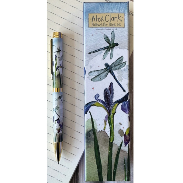 Kovová propiska v dárkové krabičce s černou náplní, otočné zavírání, motiv: vážka, kosatce; krabička 17,5*2,5*4,5 cm, značka Alex Clark Art