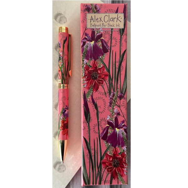 Kovová propiska v dárkové krabičce s černou náplní, otočné zavírání, motiv: jiřina; krabička 17,5*2,5*4,5 cm, značka Alex Clark Art