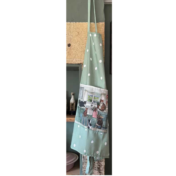Bavlněná zástěra s motivem: kočka, kuchyně; autorkou motivu je anglická malířka Alex Clark, rozměr 70*90 cm, se stuhou kolem krku, v pase na zavázání, značka Alex Clark Art.