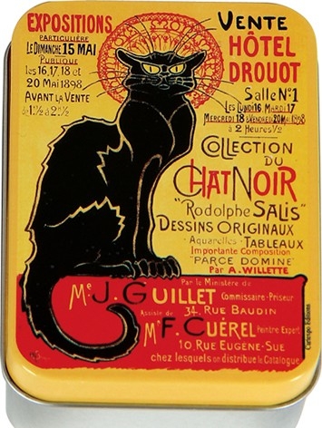 Plechová dóza s motivem plakátu Chat Noir z roku 1898 od švýcarského malíře Steinlena. Vhodná jako dárková dóza na mýdlo, pralinky či jiné drobnosti.