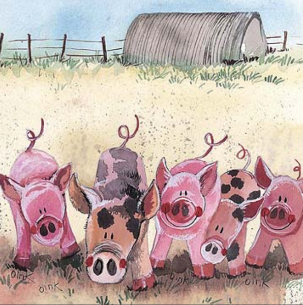 Přání do obálky s motivem prasátek, autorkou je anglická malířka Alex Clark. Rozměr 14*14 cm, značka Alex Clark Art.