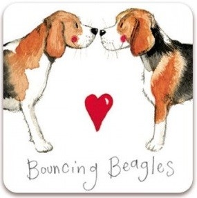Magnetka s povrchem z tvrzené syntetické pryskyřice. Motiv bígla, autorkou je anglická malířka Alex Clark, rozměr 6*6 cm, značka Alex Clark Art.