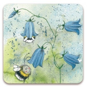 Magnetka s povrchem z tvrzené syntetické pryskyřice. Motiv: zvonky, včelka, autorkou je anglická malířka Alex Clark, rozměr 6*6 cm, značka Alex Clark Art.
