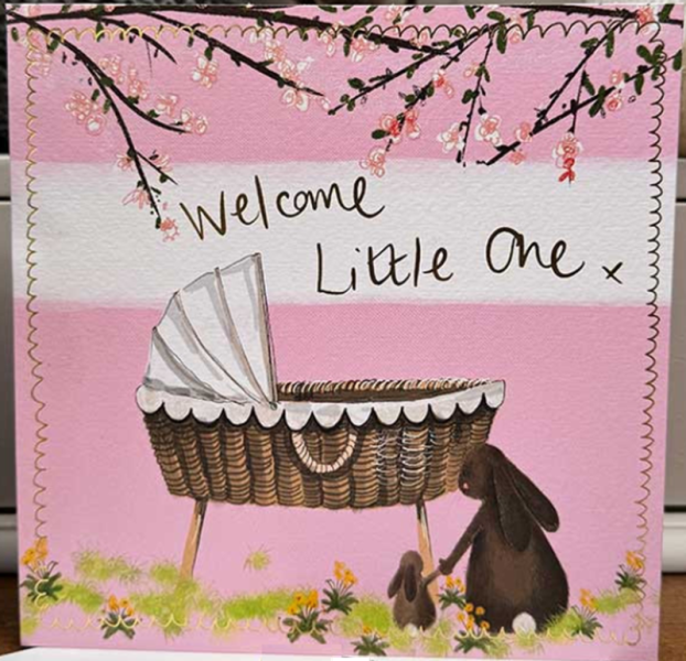 Přání do obálky k narození dítěte, v růžovém provedení; autorkou je anglická malířka Alex Clark. Přední strana přání má zlacené detaily.