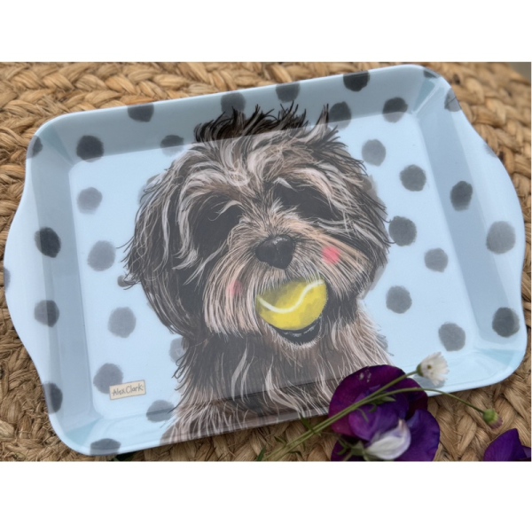 Melaminový tácek s motivem: pes, balónek; autorkou je anglická malířka Alex Clark. Není určen pro přímý styk s potravinami. Značka Alex Clark Art.